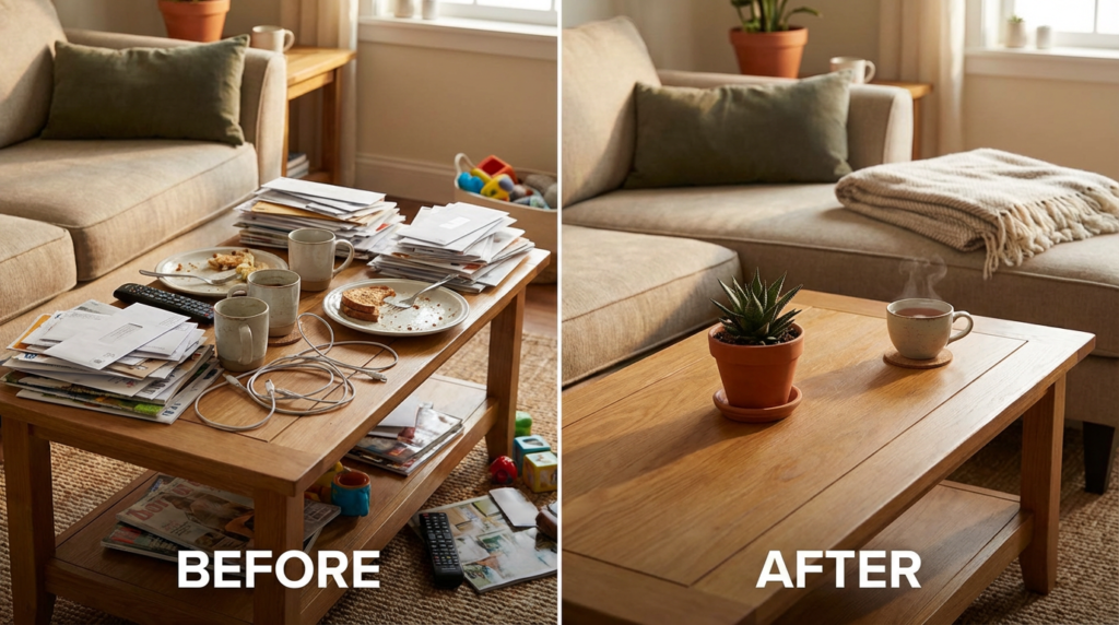 The “one surface” rule. Pick one surface — the coffee table, the nightstand, the kitchen counter — and clear it completely. Just one. Keep it clear for a few days. Notice how your brain feels when you look at that space. Let that be your anchor.