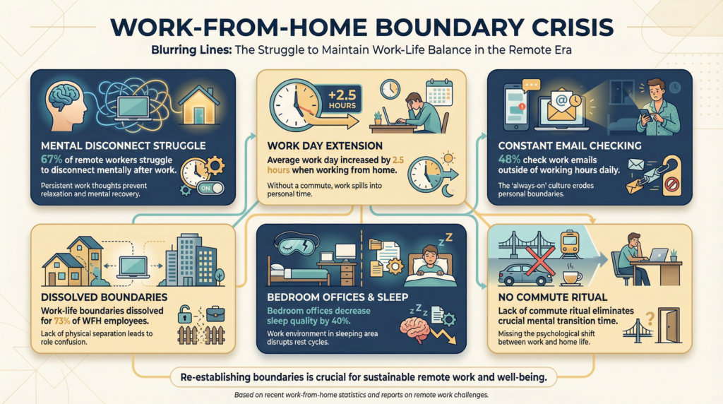 And the kicker? You are home. You’ve been home all day. Your “commute” was eight steps from the bedroom to the kitchen table. There was no transition, no boundary, no moment where work ended and life began. It all just… blurs.